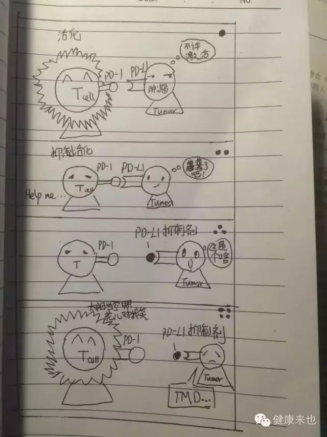 T細(xì)胞的哨兵就是PD-1,癌細(xì)胞辦假證(證件就是PD-L1),所以哨兵被騙了。PD-1單抗藥物就是憲兵,過去跟哨兵(PD-1)說,瞎眼啦,你倆別握手了,這丫的是癌細(xì)胞,干掉丫的。然后T細(xì)胞就去把癌細(xì)胞弄死了。