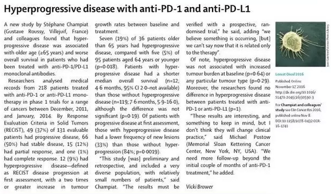 最近一期柳葉刀雜志發(fā)表評(píng)論文章,法國(guó)研究人員Champiat等發(fā)現(xiàn)大于65歲的病患接受PD-1/PD-L1單抗治療過程中出現(xiàn)腫瘤的超快進(jìn)展現(xiàn)象,而且總體生存率也較差。