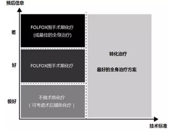 也許是由于循證醫(yī)學(xué)證據(jù)的缺乏,既往的ESMO指南一直沒(méi)有推薦靶向藥物用于初始可切除mCRC的新輔助治療,直到2015/2016年度,ESMO指南在初始可切除mCRC圍手術(shù)期治療模式的選擇上,版指南做了比較大的更改,明確提出要從"手術(shù)技術(shù)標(biāo)準(zhǔn)"和"腫瘤學(xué)預(yù)后因素"兩個(gè)維度進(jìn)行考量(圖-1)。