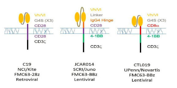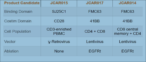 Juno Therapeutics (JUNO)則與上述的三家醫(yī)學(xué)機(jī)構(gòu)合作。在2016 6月ASCO上報(bào)道的臨床研究中,51名復(fù)發(fā)或難治性(r / r)急性淋巴細(xì)胞白血?。ˋLL)成年患者用環(huán)磷酰胺或氟達(dá)拉濱/ 環(huán)磷酰胺,然后輸注JCAR015。隨訪研究觀察到90%的完全緩解率(CR)。然而在同年7月6日,JCAR015在Ⅱ期臨床試驗(yàn)中導(dǎo)致2例患者腦水腫死亡而被叫停。JUNO認(rèn)為是由于CAR-T治療前用藥氟達(dá)拉濱引起。但是去除氟達(dá)拉濱后繼續(xù)臨床試驗(yàn),11月23日又出現(xiàn)了三個(gè)腦水腫死亡病例,JUNO不得不終止JCAR015臨床試驗(yàn),痛失了在CAR-T的領(lǐng)先地位。JUNO將其重心轉(zhuǎn)向其它產(chǎn)品,JCAR17 和 JCAR14等。它們的區(qū)別見圖9。