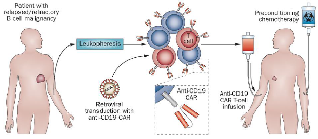 從圖8中看出,CD19在pre-B 和 成熟B細(xì)胞,包括正常和惡性增殖的B細(xì)胞表達(dá), 但是淋巴干細(xì)胞和成熟漿細(xì)胞沒有CD19。帶有抗CD19 scFv 的CAR-T 細(xì)胞可以攻擊pre-B 和成熟B細(xì)胞而不傷害淋巴干細(xì)胞,保留了淋巴干細(xì)胞的再生功能。使用抗CD19的CAR-T細(xì)胞進(jìn)行