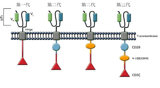 細(xì)胞內(nèi)信號(hào)轉(zhuǎn)導(dǎo)區(qū)主要為CD3ζ或FcεRIγ含有免疫受體酪氨酸活化基序(immunoreceptor tyrosine-based activation motifs, ITAM,)以及第二刺激信號(hào)CD28或者其它分子,4-1BB, OX40等正向協(xié)同刺激信號(hào)。根據(jù)CAR結(jié)構(gòu)的進(jìn)化,有第一代,第二代和第三代。幾代CAR-T的區(qū)別在于細(xì)胞內(nèi)信號(hào)轉(zhuǎn)到區(qū)連入了不同的正向協(xié)同刺激信號(hào):第一代CAR(左)由單鏈抗體通過跨膜區(qū)域與胞內(nèi)信號(hào)傳導(dǎo)區(qū)(ITAM)相連, ITAM通常為CD3ζ或FcεRIγ; 第二代CAR(中)的胞內(nèi)信號(hào)轉(zhuǎn)導(dǎo)區(qū)引入了共刺激分子, 主要為CD28 或4-BB; 第三代CAR(右)同時(shí)引入了兩個(gè)共刺激分子, 主要為CD28加上4-BB 或OX40。早期的實(shí)驗(yàn)證明了CAR-T 的可行性,然而第一代CAR 只能引起短暫的T 細(xì)胞增殖和較低的細(xì)胞因子分泌,不能提供長時(shí)間的T 細(xì)胞擴(kuò)增信號(hào)和持續(xù)的體內(nèi)抗腫瘤效應(yīng)。依照T 細(xì)胞活化的雙信號(hào)學(xué)說,T 細(xì)胞的激活和增殖需要兩個(gè)共刺激信號(hào);第二代、第三代CAR 引入了共刺激分子信號(hào)序列,旨在提高T 細(xì)胞的細(xì)胞毒活性、增殖性與存活時(shí)間,并且促進(jìn)細(xì)胞因子的釋放。