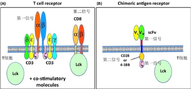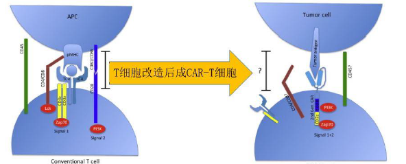 圖3, T 細(xì)胞兩個(gè)激活信號(hào),CAR將兩個(gè)激活信號(hào)結(jié)合在一起。
