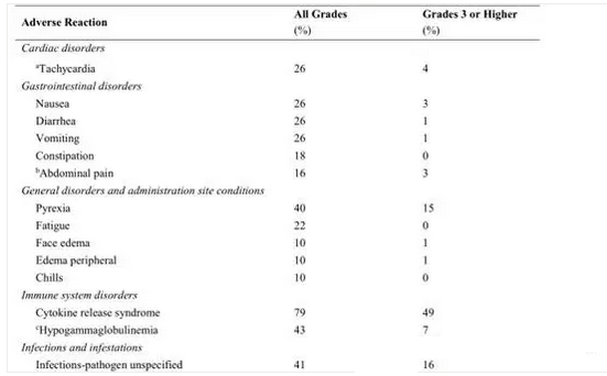 最常見的不良反應(yīng)(發(fā)生率大于20%)包括低丙種球蛋白血癥,感染不明病原體,發(fā)熱,食欲降低,頭痛,腦病,出血,低血壓,心動(dòng)過速,惡心,腹瀉,嘔吐,缺氧,疲勞,急性腎損傷和譫妄。