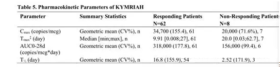 下表5總結(jié)了KYMRIAH的藥代動(dòng)力學(xué)參數(shù)