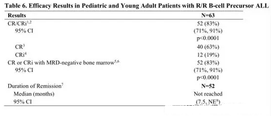 1 CR / CRi是根據(jù)所有接受KYMRIAH并完成至少3個(gè)月隨訪的患者計(jì)算的,或在數(shù)據(jù)截止前較早停藥。要求緩解狀態(tài)維持至少28天,無臨床證據(jù)復(fù)發(fā)。