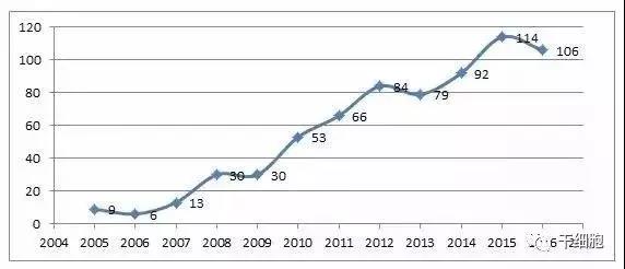 表1 2005年-2017年間充質干細胞臨床研究變化趨勢