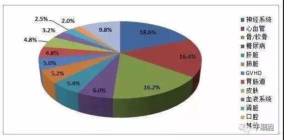 從治療的疾病種類來看,間充質干細胞的臨床研究涉及上百種疾?。ū?)。將這些疾病按照器官系統(tǒng)分類,可以發(fā)現神經系統(tǒng)、心血管和骨科疾病是三類主要的研究領域,占比都在15%以上,總和超過一半。另外,糖尿病、肝臟、肺臟、胃腸道、皮膚和移植物抗宿主?。℅VHD)的比例都在5%左右,是間充質干細胞重要的臨床研究方向。