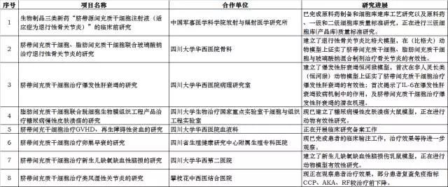 同時,實驗室還與中國軍事醫(yī)學科學院、四川大學華西醫(yī)院、四川省生殖健康研究中心、四川大學華西第二醫(yī)院、攀枝花中西醫(yī)結合醫(yī)院等開展臍帶間充質干細胞臨床研究如下: