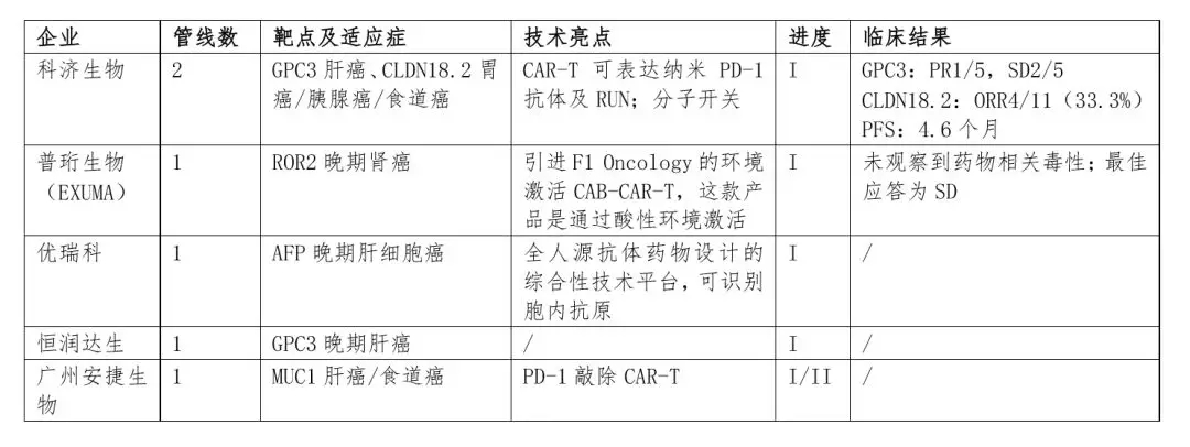 從上表來(lái)看,除了GPC3之外,其他蛋白抗原都存在與人體正常組織中,因此控制CAR-T的on-target毒性成為非常關(guān)鍵的因素。根據(jù)臨床推進(jìn)來(lái)看,可以關(guān)注MSLN,GPC3以及新型腫瘤特異性靶點(diǎn)在臨床上的進(jìn)展。