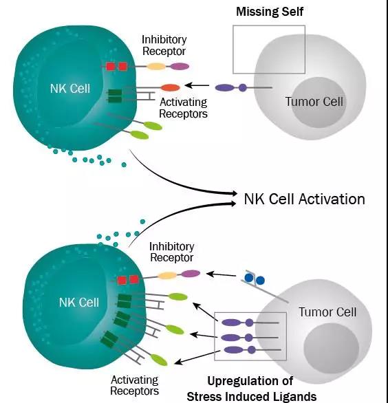 有兩類腫瘤細(xì)胞會(huì)激活NK細(xì)胞的殺傷作用,一種是丟失了MHC I受體的,這類細(xì)胞可以逃脫T細(xì)胞的殺傷,但因?yàn)閬G掉了NK細(xì)胞抑制信號而成為了NK細(xì)胞消滅的目標(biāo)。