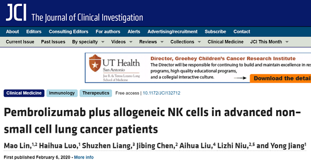 2020年5月,這個設想由國內的研究團隊率先實錘,證實PD-1(派姆單抗,K藥)加同種異體NK細胞在先前接受過治療的晚期NSCLC患者中安全有效。并發(fā)表在國際頂級期刊《The Journal of Clinical Investigation》上。