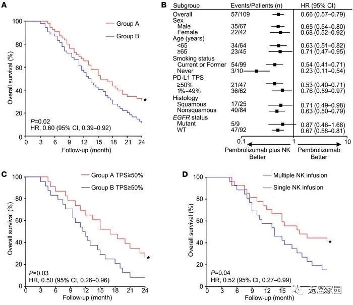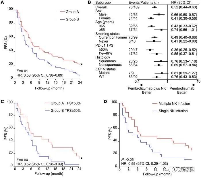 在PD-L1 ≥50%的患者中,A組患者的中位OS為17.0個月,比B組患者的中位OS更長(圖C)。此外,接受多療程NK細胞輸注的患者的中位OS明顯長于僅接受單療程NK細胞輸注的患者(圖D)