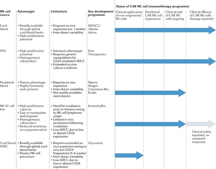 目前NK細(xì)胞的來源包括外周血單個(gè)核細(xì)胞(PBMCs)、造血干/祖細(xì)胞(HSPCs)、誘導(dǎo)性多能干細(xì)胞(iPSCs)、臍帶血和永生細(xì)胞系等,不同來源各有其優(yōu)劣性,其中基于臍帶血和iPSCs的療法開發(fā)進(jìn)度相對(duì)最快。