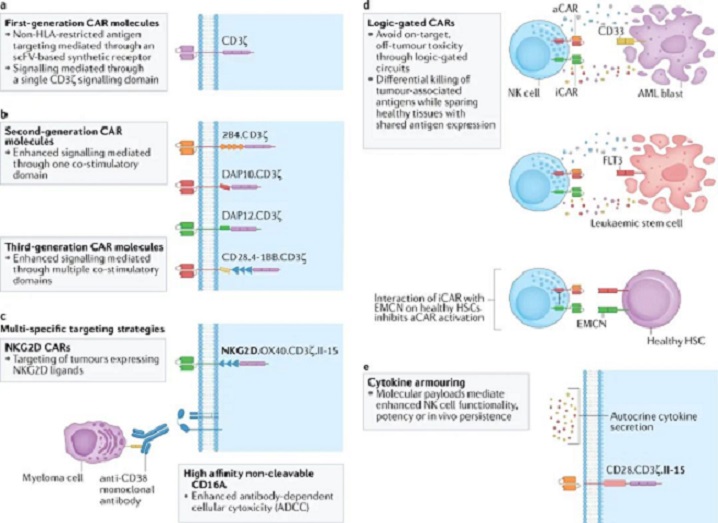 嵌合抗原受體(CAR)能修飾T細(xì)胞,搞出大獲成功的CAR-T療法,那也可以把NK細(xì)胞“CAR一下”,讓NK細(xì)胞能夠識(shí)別癌細(xì)胞表面抗原,而且與CAR有關(guān)的抗原非依賴性信號(hào)(tonic signaling),也可能更好地激活NK細(xì)胞的抗腫瘤活性。