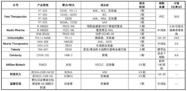 根據(jù)ClinicalTrials.gov網(wǎng)站公示信息,目前已有許多CAR-NK產(chǎn)品的臨床試驗正在開展中,大部分處于I/II期臨床試驗階段。靶點多數(shù)是常見的惡性血液癌癥靶點(如CD19、CD20、BCMA、CD33)等。還有一些CAR-NK產(chǎn)品靶向的是實體腫瘤相關(guān)抗原(如間皮素、ROBO1、NKG2D)等。CAR-NK細胞在腫瘤中的作用正在被廣泛研究。目前已經(jīng)進入臨床研究階段的代表企業(yè)和CAR-NK管線梳理[表1]。