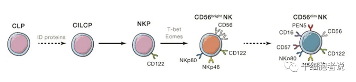 NK細胞在機體內(nèi)由CD34+造血祖細胞(HPC)發(fā)育而來,是一個連續(xù)的過程,共同淋巴細胞祖細胞(CLPs)逐漸下調(diào)CD34,上調(diào)CD56,促使NK細胞分化與成熟[圖2]。