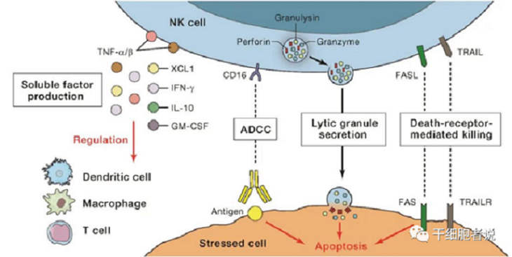 § NK細胞分泌大量細胞因子(如IFN-γ、TNF-α、TNF-β、IL-10),生長因子(如GM-CSF)和趨化因子(如CCL3、CCL4、CCL5、XCL1),招募巨噬細胞、DC細胞、T細胞等友軍協(xié)同抗戰(zhàn)。