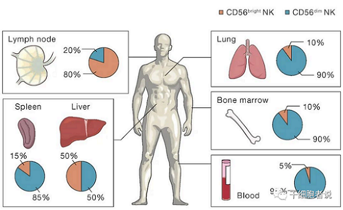 NK細胞主要存在于淋巴結(jié)、骨髓、外周血、肺、脾臟、肝臟等器官內(nèi);CD56的表達可以分兩個NK細胞亞群,CD56dim和CD56bright,其中CD56- NK細胞具有抗腫瘤細胞毒性,并且兩個亞群都能夠產(chǎn)生細胞因子。[圖3]。
