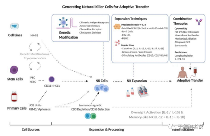 與其他免疫細胞類似,NK細胞療法的技術(shù)流程包括三部分:種子細胞、擴增制備、臨床使用。