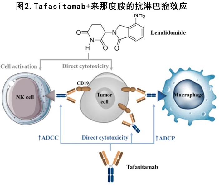 Tafasitamab 是一種 Fc 增強(qiáng)的人源化抗CD19單抗,在 B 細(xì)胞惡性腫瘤中表現(xiàn)出活性,并與來那度胺具有協(xié)同效應(yīng),來那度胺能夠增強(qiáng)自然殺傷細(xì)胞介導(dǎo)的、抗體依賴性的細(xì)胞毒(圖2)。II 期多中心單臂 L-MIND 研究(表2中的[56])在不適合移植的R/R DLBCL 中評(píng)估了tafasitamab + 來那度胺 (tafa + LEN) 聯(lián)合治療。該療程包括tafasitamab + 來那度胺最長12個(gè)月,隨后 tafasitamab 單藥治療直至疾病進(jìn)展。該方案非常高效,ORR為61% (CR 43%),中位緩解持續(xù)時(shí)間為21.7個(gè)月且毒性特征合理?;谠摻Y(jié)果,2020年tafasitamab聯(lián)合來那度胺獲得FDA和EMA加速批準(zhǔn)用于治療不適合移植的R/R DLBCL。