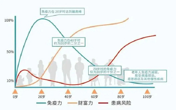 △人體免疫機能從20歲后不斷下降,從40歲開始,患病患癌風險概率逐漸增加