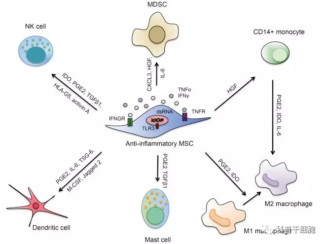 △干細胞調(diào)控免疫系統(tǒng)示意圖如間充質(zhì)干細胞在TNFα, IL-1α, IL-1β等促炎因子的刺激下,所分泌的趨化因子(CCL5、CXCL10),生長因子(TGF-β、HGF),細胞因子(IDO)以及抗炎小分子(PGE2),能抑制炎癥反應(yīng)及炎癥相關(guān)細胞TH1和TH17、漿細胞、促炎性M1巨噬細胞、自然殺傷性細胞及中性粒細胞的遷移、增殖。